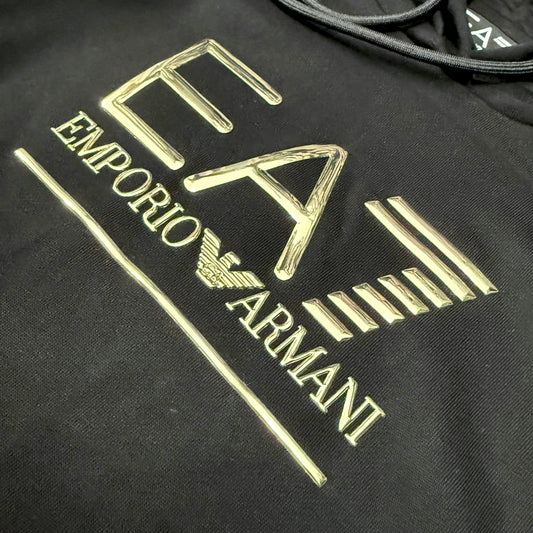Felpa EMPORIO ARMANI Donna oversize con cappuccio, tex. garzato, con logo in rilievo oro, Col.Nero (veste grande, si consiglia una tg. In meno)