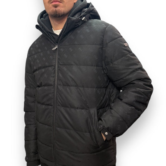 Giubbotto GUESS Uomo con cappuccio sganciabile, Pattern lucido, Col.Nero