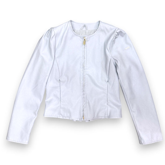 Giacca in ecopelle YES-ZEE, con rouches sulle spalle e sul retro, Col.Celeste pastello